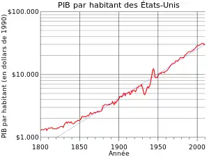En 1913, le PIB/hab français était de 3 485 dollars internationaux (base 1990)[18]. En 1998, il était de 19 558 $. Le taux de croissance moyen du PIB/hab était donc de 2,0 % sur cette période. S'il avait été de 1,0 %, le niveau de vie aurait été de 8 200 $ en 1998, soit un peu moins que le niveau de vie réel de l'Uruguay (8 314 $).