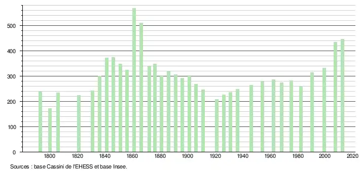 L'évolution du nombre d'habitants est connue à travers les recensements de la population effectués dans la commune depuis 1793. À partir du , les populations légales des communes sont publiées annuellement dans le cadre d'un recensement qui repose désormais sur une collecte d'information annuelle, concernant successivement tous les territoires communaux au cours d'une période de cinq ans. Pour les communes de moins de 10 000 habitants, une enquête de recensement portant sur toute la population est réalisée tous les cinq ans, les populations légales des années intermédiaires étant quant à elles estimées par interpolation ou extrapolation[15]. Pour la commune, le premier recensement exhaustif entrant dans le cadre du nouveau dispositif a été réalisé en 2007[16],[Note 2].