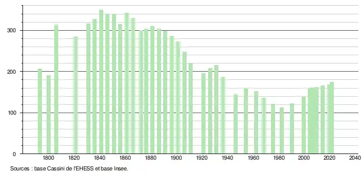 L'évolution du nombre d'habitants est connue à travers les recensements de la population effectués dans la commune depuis 1793. Pour les communes de moins de 10 000 habitants, une enquête de recensement portant sur toute la population est réalisée tous les cinq ans, les populations légales des années intermédiaires étant quant à elles estimées par interpolation ou extrapolation[15]. Pour la commune, le premier recensement exhaustif entrant dans le cadre du nouveau dispositif a été réalisé en 2004[16].