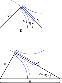 soit α = π/4 = 45° pour quatre rainures, et α = π/6 = 30° pour six rainures. On a alors les relations suivantes entre l'entraxe E, le rayon de la roue menante R1 et le rayon de la roue menée R2 :
