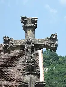 « Cette croix de Pierre, datée de 1514, est située à la croisée de deux chemins et entourée, sur la moitié arrière, d'un petit parapet demi-circulaire. Une borne protège le parapet et la croix elle-même contre l'accrochage des voitures venant du haut de la pente. La croix est montée sur un socle de plan carré dont chaque face figure un pignon. La face dirigée vers le chemin porte un bénitier saillant taillé dans la pierre. Le fût s'élève à la rencontre des rampants du couronnement du socle. Il est de plan octogonal et les pans coupés viennent s'amortir en bases moulurées selon la mode du XVe siècle. Ce fût est relié à la croix proprement dite par une bague moulurée. Les bras de la croix sont également de coupe octogonale et au pied de celle-ci, sur les quatre pans coupés, sont placés des petits culs-de-lampes sculptés, qui devaient porter des statuettes disparues. Les trois bras de la croix se terminent par des fleurons, composés chacun de crochets partant des pans coupés de la croix, mais ne comportant pas de motif central. La croix est décorée sur la face antérieure d'un Christ, dont la tête est surmontée d'un petit dais finement sculpté; sur la face postérieure, à un niveau plus élevé que ceux des pans coupés, d'un petit cul-de-lampe portant une Vierge à l'enfant. Cette croix est en excellent état de conservation. » Julien Polti, Architecte en chef des Monuments Historiques.