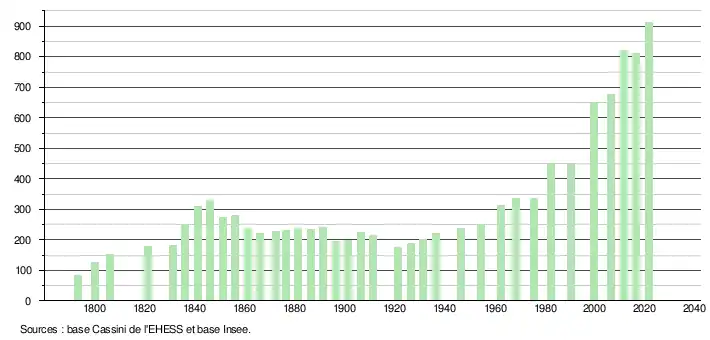 L'évolution du nombre d'habitants est connue à travers les recensements de la population effectués dans la commune depuis 1793. Pour les communes de moins de 10 000 habitants, une enquête de recensement portant sur toute la population est réalisée tous les cinq ans, les populations légales des années intermédiaires étant quant à elles estimées par interpolation ou extrapolation[26]. Pour la commune, le premier recensement exhaustif entrant dans le cadre du nouveau dispositif a été réalisé en 2006[27].
