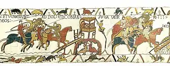 En 1064[27], Guillaume de Normandie mène une expédition contre la Bretagne à laquelle participe activement Harold Godwinson, qui sera ensuite son adversaire à la bataille d'Hastings. La tapisserie de Bayeux, scène 18 à 20, relate les prises successives des forteresses de Dol-de-Bretagne, Rennes (ou Conan II de Bretagne s'est réfugié après avoir fui Dol-de-Bretagne) et Dinan (où Conan rend les clefs de la ville au bout d'une lance). En 1076, Guillaume lance une nouvelle campagne militaire en Bretagne et investit Dol, dont le siège est levé par l’ost conduit par le roi des Francs Philippe Ier[28].