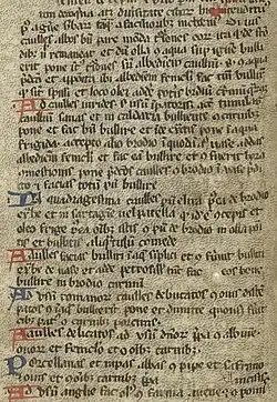 Le premier livre de cuisine italienne, Liber de coquina, est écrit vers 1300 à la cour angevine du royaume de Naples, sans doute d'après un modèle de la période souabe du Saint-Empire romain germanique, et voit le jour à Palerme à la cour du roi Frédéric II de Sicile. On y trouve déjà quelques plats essentiels de la cuisine italienne comme les lasagnes et d'autres variétés de pâtes[5].