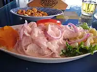 - Ceviche de corvina : morceaux de poisson cru macérés dans du jus de citron vert, considéré le plat national. On remplace néanmoins souvent le poisson par des fruits de mer, du poulpe, etc.