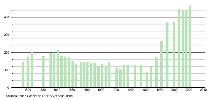 L'évolution du nombre d'habitants est connue à travers les recensements de la population effectués dans la commune depuis 1793. Pour les communes de moins de 10 000 habitants, une enquête de recensement portant sur toute la population est réalisée tous les cinq ans, les populations légales des années intermédiaires étant quant à elles estimées par interpolation ou extrapolation[37]. Pour la commune, le premier recensement exhaustif entrant dans le cadre du nouveau dispositif a été réalisé en 2006[38].