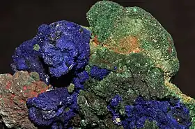 Le métal natif est fusible vers 1 083 °C. Au refroidissement à l'air, une couche noire d'oxydes est observable. Toutefois, à des températures ambiantes, exposé à l'air, ce métal natif est fréquemment oxydé en cuprite, en pellicule de malachite verte, en chessylite, en lumite. Une des caractéristiques remarquables de la plupart des oxydes de cuivre ou des composés d'oxydation du cuivre est leur rôle couvrant. La surface d'altération est superficielle[Note 5]. Elle est verdâtre, noirâtre, iridescente dans le cas de la malachite. Le vert de gris est une patine qui contient souvent malachite et azurite encore dénommée chessylite, soit des carbonates hydroxylés basiques de cuivre II.