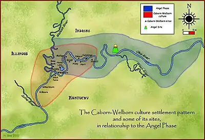 La culture de Caborn-Welborn est composée de plus de 80 sites principalement situés sur des crêtes longeant les rivières Wabash et Ohio, allant de Geneva, dans le Kentucky (en) jusqu’à l’embouchure de la rivière Saline de l’Illinois (en). La plupart des sites sont concentrés autour de la confluence des rivières Ohio et Wabash. Leur taille varie, allant de 0,6 are à 35 ares pour les villages les plus grands[2]. Une majeure partie des sites archéologiques se situent sur les crêtes supérieures de la plaine inondable, habituellement près de marécages et marais. Le lit supérieur de la rivière Ohio dans cette région comporte un vaste système de digues naturelles, parallèles à la rivière et séparées par des zones marécageuses[3].