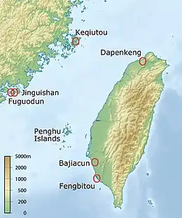 Taïwan a été occupée par des populations paléolithiques, qui ont atteint l'île au cours de la dernière période glaciaire, vers la fin du Pléistocène, lorsque le niveau de la mer était plus bas et le détroit de Taïwan remplacé par un passage terrestre[19]. Bien que la culture de Changbin du Paléolithique chevauche les premiers sites de Dapenkeng, les archéologues n'ont trouvé aucune preuve de développement évolutif et supposent que la culture de Dapenkeng doit être venue d'ailleurs. La candidate la plus probable à cette « origine » est la côte du Fujian, de l'autre côté du détroit de Taïwan, lequel a 130 km de large en son point le plus étroit[20]. Cependant les données archéologiques de cette région sont tout à fait limitées :