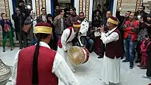 La danse de rboukh reflète quant à elle un phénomène social né dans les milieux ouvriers des villes tunisiennes[71]. Cette danse masculine, accompagnée de chants d'amour souvent libertins évoquant la séduction, l'attirance charnelle et les plaisirs de la vie, est longtemps exécutée dans les cafés sur les rythmes de la darbouka et du mezoued[71]. Plusieurs gestes rappellent les mouvements quotidiens des ouvriers (halage, piochage ou terrassement)[72]. Depuis les années 1970, elle a quitté les cafés et caractérise souvent les fêtes et les cérémonies de circoncision ou de mariage dans les quartiers populaires des grandes villes tout en voyant disparaître les scènes jugées obscènes[72].
