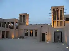 Les ressources étant limitées et les conditions de vies rudes, les matériaux de constructions utilisés par les Émiriens étaient simples, tout en étant adaptés au climat et à l’environnement. Tandis qu’elles utilisaient des tentes facilement transportables durant leurs voyages, les premières tribus construisirent également des maisons faites de boue et recouvertes par des feuilles de palmier. Ces matériaux isolaient l’intérieur de ces demeures de la forte chaleur. Les pièces des habitations étaient généralement disposées autour d’une cour intérieure où les repas étaient préparés pour toute la maisonnée. Pour améliorer la ventilation, des tours à vent (ou badgir) furent construites.