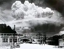 Le champignon atomique est aussi un type de pyrocumulonimbus. Le largage de la bombe atomique sur Hiroshima se fit par temps clair. Peu après, le champignon atomique se forma et il commença à tomber de la pluie noire qui était pleine de suie radioactive. Cette pluie tua de nombreuses personnes. Le champignon atomique se développa dans la stratosphère et entraîna de nombreuses particules qui restèrent piégées (voir la théorie de l'hiver nucléaire). Il n'a pas été fait état de phénomènes électriques ou de chutes de grêle, car il semble que la présence de suie empêcha la formation de grosses gouttes ou de grêlons. Même si le champignon atomique peut être assimilé à un très gros cumulonimbus, il ne peut pas être assimilé à un orage supercellulaire. D'après le nouvel atlas, un tel nuage pourrait être appelé cumulonimbus homogenitus car le champignon atomique n'est pas à l'origine engendré par l'incendie de la ville touchée[29].