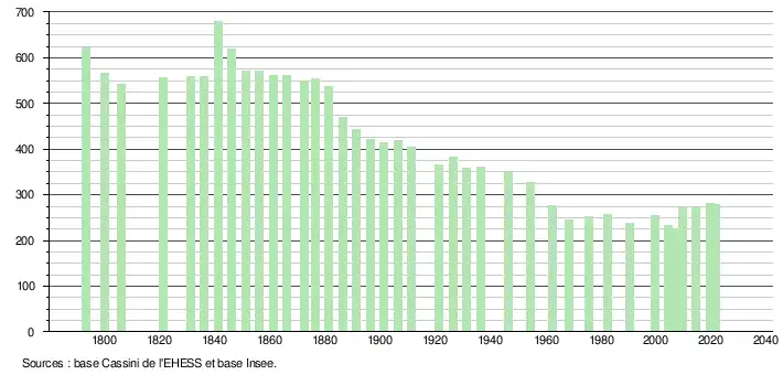 L'évolution du nombre d'habitants est connue à travers les recensements de la population effectués dans la commune depuis 1793. Pour les communes de moins de 10 000 habitants, une enquête de recensement portant sur toute la population est réalisée tous les cinq ans, les populations légales des années intermédiaires étant quant à elles estimées par interpolation ou extrapolation[23]. Pour la commune, le premier recensement exhaustif entrant dans le cadre du nouveau dispositif a été réalisé en 2004[24].