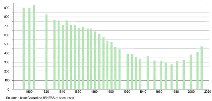 - Dans le tableau des recensements et le graphique, par convention dans Wikipédia, le principe a été retenu, pour les populations légales postérieures à 1999 de n’afficher dans le tableau des recensements et le graphique que les populations correspondant à l'année 2006, première population légale publiée calculée conformément aux concepts définis dans le décret no 2003-485 du 5 juin 2003, et les années correspondant à une enquête exhaustive de recensement pour les communes de moins de 10 000 habitants, ainsi que la dernière population légale publiée par l’Insee.