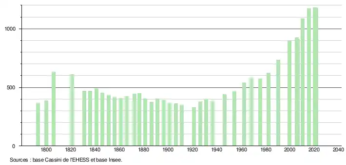 L'évolution du nombre d'habitants est connue à travers les recensements de la population effectués dans la commune depuis 1793. Pour les communes de moins de 10 000 habitants, une enquête de recensement portant sur toute la population est réalisée tous les cinq ans, les populations légales des années intermédiaires étant quant à elles estimées par interpolation ou extrapolation[21]. Pour la commune, le premier recensement exhaustif entrant dans le cadre du nouveau dispositif a été réalisé en 2005[22].