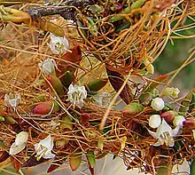 Cuscuta californica est une plante parasite qui grimpe sur d'autres plantes et se nourrit directement d'elles par l'intermédiaire d'un haustorium. La cuscute ressemble à un tas de paille jaune-orange enroulé autour de sa plante hôte. Les feuilles sont réduites à des écailles à la surface de la tige, car elles ne sont pas nécessaires à la photosynthèse lorsque la cuscute obtient des nutriments de son hôte.