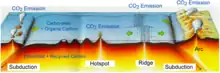 En conséquence, le carbone peut rester dans le manteau inférieur pendant de longues périodes de temps, mais de grandes concentrations de carbone retrouvent fréquemment leur chemin vers la lithosphère. Ce processus, appelé dégazage de carbone, est le résultat de la fonte carbonatée du manteau par décompression, ainsi que des panaches du manteau transportant les composés carbonés vers la croûte[18] Le carbone est oxydé lors de son ascension vers les points chauds volcaniques, où il est ensuite libéré sous forme de CO2. Cela se produit pour que l'atome de carbone corresponde à l'état d'oxydation des basaltes en éruption dans ces zones[19].