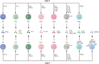 Les sous-ensembles de cellules Th et les sous-ensembles Tc partagent les mêmes signaux cytokiniques , les facteurs de transcription déterminant la lignée et les profils de cytokines effectrices. Les cellules Tc1 peuvent être différenciées dans des conditions d'IL-12 et produire de l'interféron γ grâce à l'activation des facteurs de transcription TBET et STAT4. Les cellules Tc2 peuvent être différenciées dans des conditions d'IL-4 et produire de l'IL-4, de l'IL-5 et de l'IL-13 via GATA-3 et STAT6