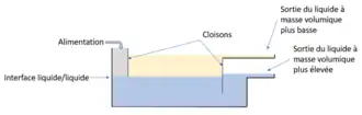 Le mélange à traiter entre dans le décanteur et les différents liquides qui le constituaient sortent séparément clarifiés. Le décanteur le plus connu dans cette catégorie est le décanteur florentin. Ce décanteur travaille en continu. L'alimentation du mélange se fait au niveau de l'interface liquide/liquide pour limiter les turbulences.