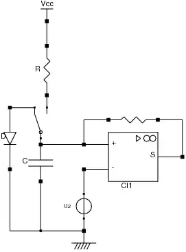 La présence de l'amplificateur opérationnel monté en trigger de Schmitt (ou comparateur à hystérésis) est destinée à empêcher le clignotement de la sortie dans le cas où la tension aux bornes du condensateur n'est pas purement exponentielle (des ondulations sur la courbe peuvent exister).