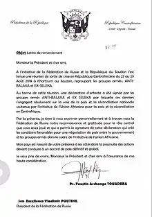 Tenons à exprimer nos sincères remerciements à la République de Soudan et au peuple soudanais ainsi qu'à Son Excellence, Monsieur Oumar EI BECHIR, Président de la République, Chef de l'État pour l'accueil fraternel et chaleureux. Nous ne pouvons oublier l'État de la Russie et les Représentants de la coopération Russie-RCA pour la bonne réussite de cette rencontre.