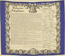 Déclaration d'indépendance des États-Unis imprimée sur un tissu, vers 1876.