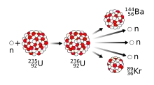 Dans leur seconde publication sur la fission nucléaire en février 1939, Hahn et Strassmann utilisaient pour la première fois le terme Uranspaltung (fission de l'uranium) et prédisaient l'existence et la libération de neutrons supplémentaires au cours du processus de fission, ouvrant la possibilité à une réaction nucléaire en chaîne[110].