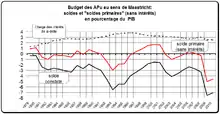 | 1974 | Le budget des administrations publiques est pour la dernière fois en léger excédent[3]. Il se situe à environ 0,2% du PIB[4]. |