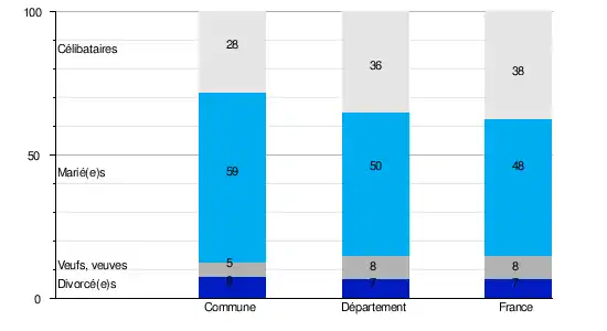 L'état matrimonial légal désigne, selon l'Insee, la situation conjugale d'une personne au regard de la loi : célibataire, mariée, veuve, divorcée[Note 2].En 2009, la commune comptait 28 % de célibataires, 59,1 % de personnes mariées, 5,4 % de veufs ou veuves et 7,5 % de divorcé(e)s[13]. Le taux de personnes mariées apparaît ainsi très supérieur à celui du département (49,8 %)[14] mais aussi de la France (47,5 %)[15].