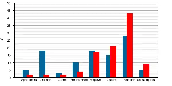 | Ouvriers | 40 | 21,3 | 24 | 15 | 15,7 | 17,3 | 13,5 | 14,9 |
