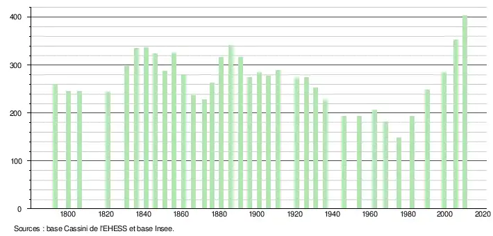 Le taux de mortalité est quant à lui passé de 12 ‰ sur la période 1968-1975 à 5,4 ‰ sur la période 1999-2009[5]. Celui du département était sur cette dernière période de 7,6 ‰ et celui de la France de 8,8 ‰[8].