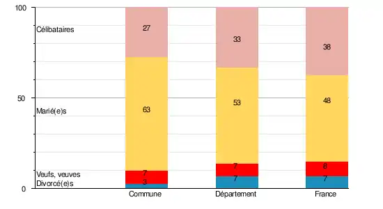 En 2009, la commune comptait 27,3 % de célibataires, 62,8 % de personnes mariées, 6,6 % de veufs ou veuves et 3,3 % de divorcé(e)s[11]. Le taux de personnes mariées apparaît ainsi très supérieur à celui du département (52,5 %)[12] mais aussi de la France (47,5 %)[13].