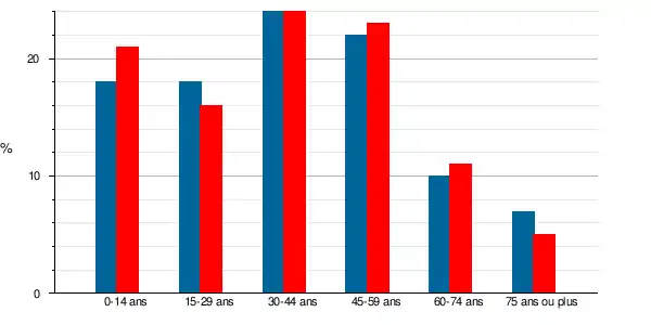 La population de la commune comporte 55,8 % d'hommes et 44,2 % de femmes. La tranche pour laquelle le déséquilibre est le plus prononcé en faveur des femmes est la tranche 75-90 ans (+27,3 % de femmes).