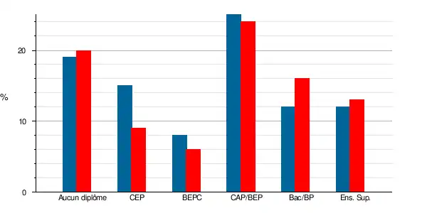 | Aucun diplôme | 1271 | 19,5 % | 1127 | 19,2 % | 17,1 | 18,4 | 18,3 | 20 |