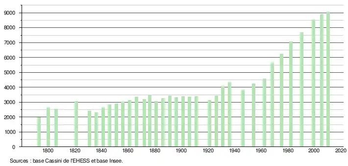 L'évolution du nombre d'habitants est connue à travers les recensements de la population effectués périodiquement dans la commune depuis 1793. Une réforme du mode de recensement permet à l'Insee de publier les populations légales des communes annuellement à partir de 2006. Pour les communes de moins de 10 000 habitants, les recensements ont lieu tous les cinq ans, les populations légales intermédiaires sont quant à elles estimées par calcul[1]. Le premier recensement exhaustif de la commune entrant dans le cadre de ce nouveau dispositif a eu lieu en 2005[2].