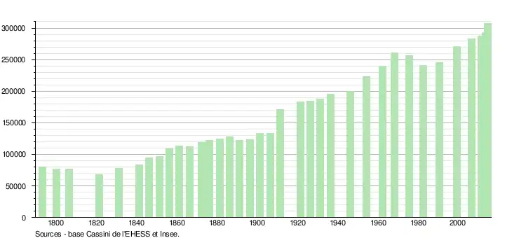 Nantes a annexé les communes de Chantenay et Doulon en 1908[12], événement qui se traduit par une brusque augmentation de population sur le graphique ci-dessous.