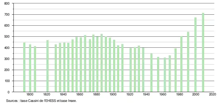 Le taux de mortalité est quant à lui passé de 8,1 ‰ sur la période 1968-1975 à 8 ‰ sur la période 1999-2009[5]. Celui du département était sur cette dernière période de 8,5 ‰ et celui de la France de 8,8 ‰[8].