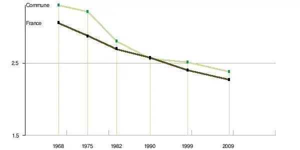 Le nombre de ménages[Note 3] tend à croître plus vite que la population : + 1,72 % par an en moyenne en France métropolitaine pour le nombre de ménages entre 1968 et 2009, + 0,74 % pour la population (tableau ci-après). Le nombre moyen de personnes par ménage tend en effet à baisser : égal à 3,06 en 1968, il n’est plus que de 2,4 en 1999 et de 2,27 en 2009[16]. La tendance est similaire pour la commune. Le nombre moyen de personnes par ménage tend également à baisser : égal à 3,3 en 1968, il n’est plus que de 2,51 en 1999 et de 2,38 en 2009[13].