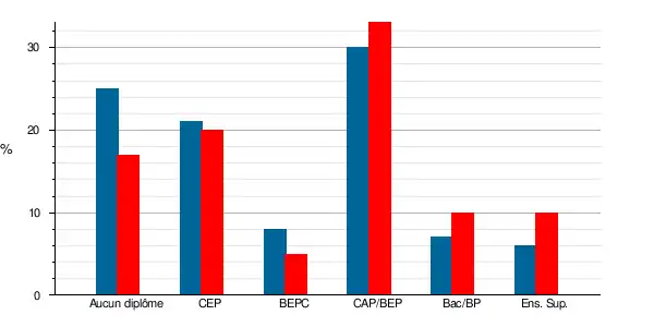 | Titulaires du certificat d'études primaires | 107 | 19,8 % | 106 | 20,5 % | 12,4 | 19 | 11,1 | 17,6 |