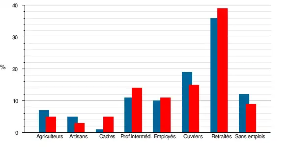 | Artisans, commerçants, chefs d'entreprise | 16 | 2,8 | 28 | 5,1 | 2,8 | 3 | 3,3 | 3,5 |