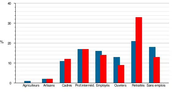 La commune comptait par ailleurs, en 2009, 2304 retraités, soit 32,8 % de la population de la commune et 5,5 % de plus que le taux départemental. Cet écart s'est toutefois réduit par rapport à celui de 1999 puisqu'il était alors de -1,2 %.