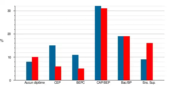 | Titulaires du BEPC, brevet des collèges | 19 | 5,3 % | 31 | 10,5 % | 5,7 | 7,4 | 6,3 | 8,1 |