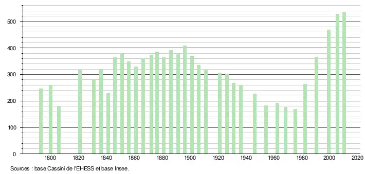 L'évolution du nombre d'habitants est connue à travers les recensements de la population effectués périodiquement dans la commune depuis 1793. Une réforme du mode de recensement permet à l'Insee de publier les populations légales des communes annuellement à partir de 2006. Pour les communes de moins de 10 000 habitants, les recensements ont lieu tous les cinq ans, les populations légales intermédiaires sont quant à elles estimées par calcul[1]. Le premier recensement exhaustif de la commune entrant dans le cadre de ce nouveau dispositif a eu lieu en 2005[2].