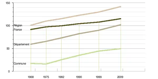 | Densité moyenne (hab/km²) | 16,6 | 15,9 | 24,8 | 34,4 | 44,1 | 49,8 | 102,2 | 141,3 | 114,8 |