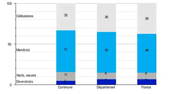 L'état matrimonial légal désigne, selon l'Insee, la situation conjugale d'une personne au regard de la loi : célibataire, mariée, veuve, divorcée[Note 2].En 2009, la commune comptait 32,1 % de célibataires, 51,3 % de personnes mariées, 11,3 % de veufs ou veuves et 5,3 % de divorcé(e)s[13]. Le taux de personnes mariées apparaît ainsi supérieur à celui du département (49,8 %)[14] mais aussi de la France (47,5 %)[15].