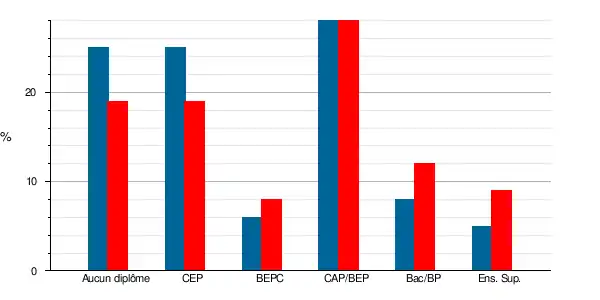 | Titulaires du certificat d'études primaires | 155 | 18,8 % | 187 | 24,7 % | 12,4 | 19 | 11,1 | 17,6 |