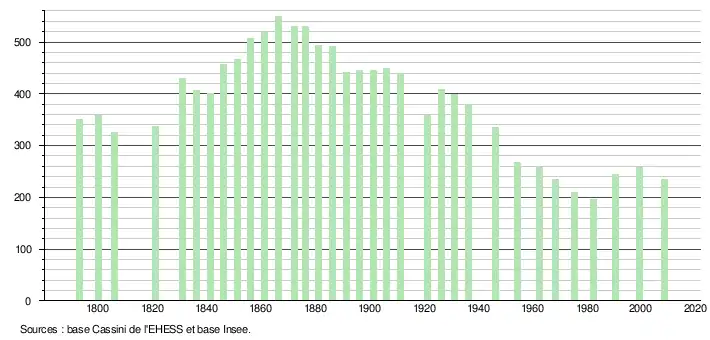 L'évolution du nombre d'habitants est connue à travers les recensements de la population effectués périodiquement dans la commune depuis 1793. Après avoir crû au XIXe siècle et atteint un maximum en 1866 avec 549 habitants, la population de la commune décroît jusqu'en 1982 avec un minimum à 196 habitants avant de se stabiliser.
