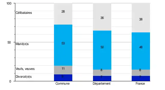 L'état matrimonial légal désigne, selon l'Insee, la situation conjugale d'une personne au regard de la loi : célibataire, mariée, veuve, divorcée[Note 2].En 2009, la commune comptait 27,8 % de célibataires, 53 % de personnes mariées, 10,6 % de veufs ou veuves et 8,6 % de divorcé(e)s[13]. Le taux de personnes mariées apparaît ainsi supérieur à celui du département (49,8 %)[14] mais aussi de la France (47,5 %)[15].