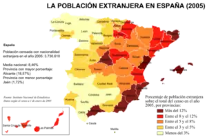 Au , on recense en Espagne 5 520 133 étrangers soit 11,7 % de la population totale[13], alors que leur nombre était de 637 085 en 1998. L'Espagne est ainsi devenue en quelques années un des premiers pays d'immigration de la planète. Cependant, dès la fin de l'année 2008, avec l'irruption de la crise économique mondiale, le mouvement d'immigration ralentit fortement, et s'inversa même pour de nombreuses nationalités, une partie des immigrés désormais sans travail retournant dans leur pays d'origine. Au premier janvier 2014, le nombre d'étrangers s'établit à 5 millions, il a baissé de 9,8 % en un an et représente 10,7 % de la population totale[15].