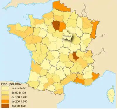La densité de population de l'Yonne, 44,9 habitants par kilomètre carré en 2021, est deux fois inférieure à celle de la France entière qui est de 106,5 hab./km2 pour la même année.